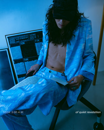 Rickyy Wong Studio's Spring-Summer 2024 Men's Collection is an exquisite ode to the transient beauty of the human spirit at the cusp of dawn, spe- cifically the trans-formative hour of 5 AM. It is an exploration of the liminal space where night softly surrenders to day, delving into the captivating expe- riences that unfold during this magical hour.